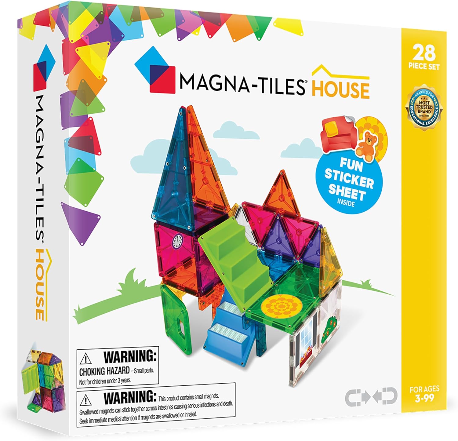 Popular house open-ended magnetic construction set - theme with staircases, “C” and “T” shapes and a bonus, reusable sticker sheet.